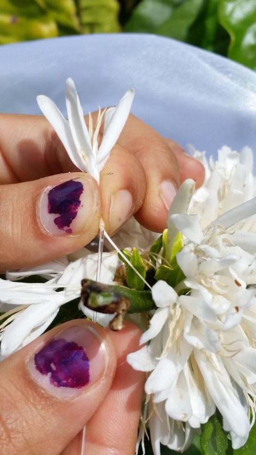 Here you can see me using a microcapillary tube to ‘suck’ up the nectar. The tubes are a certain volume (in this case 15 micro-liters). Knowing how long the microcapillary tube is, and how long the nectar amount is within tube, we can calculate the volume of nectar within the flower.