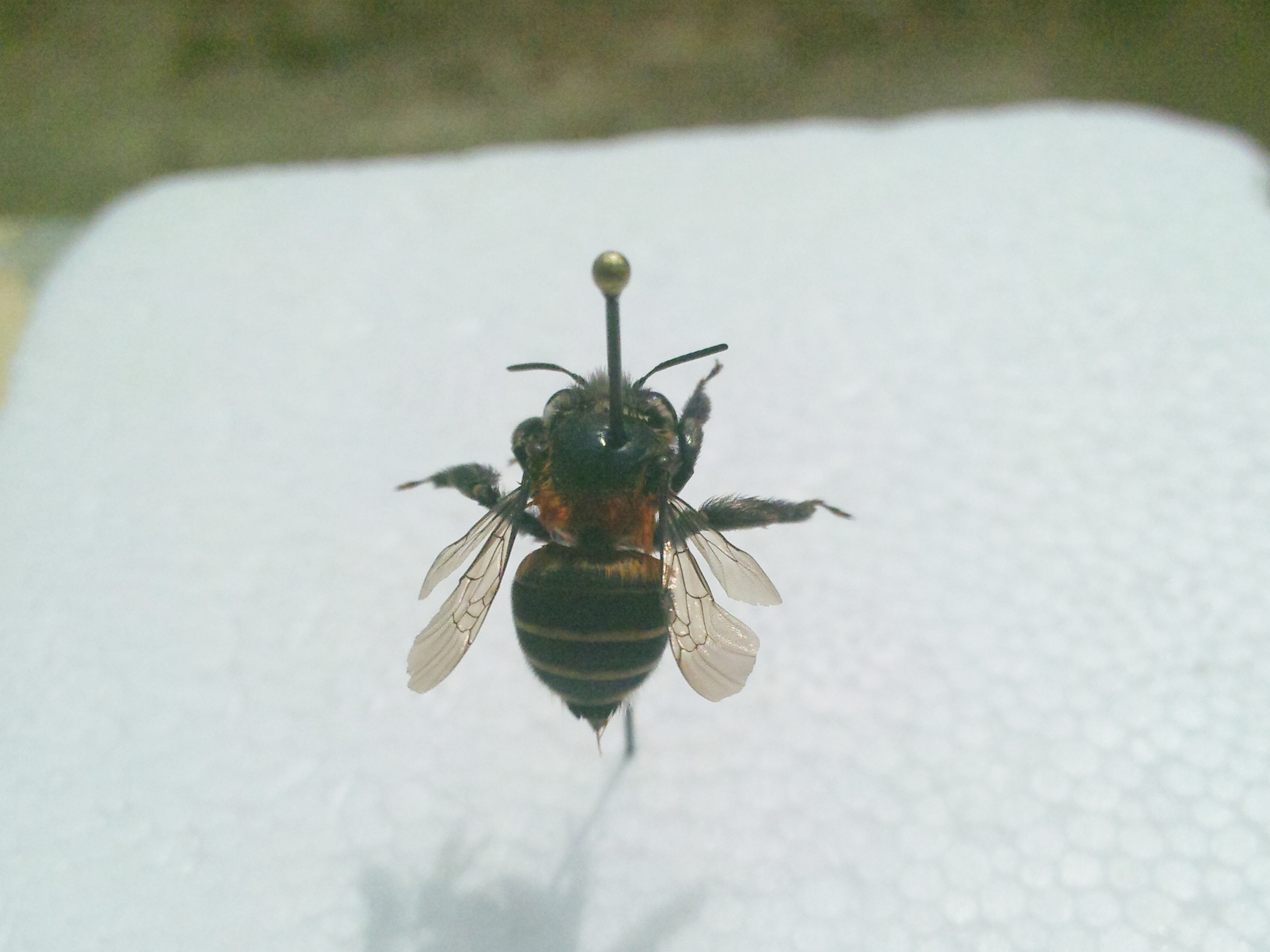 - Integumental coloration : Dark brown on dorsum and sides, reddish-brown on ventral surface; T1-T4 with transverse apical ivory integumental bands.