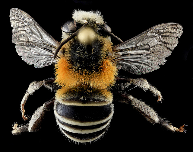 - Pubescence: Head mostly white with black hairs intermixed on vertex and ocellar areas; white hairs in paraocular areas dense such that integument is barely visible if at all. Scutum, pleura and ventral surfaces densely covered with fox-red hair intermixed with black hair; scutellum, metanotum, propodeal area with fox-red hair but dorsal surface of thorax still visible; hair on legs chocolate-brown; hair on legs chocolate-brown (sometimes all black in melanic specimens from Puerto Rico and Hispaniola); T2-T4 with suppressed black hair, additionally T4 with narrow transverse apical band of white hair; T5 with black hair and white hair laterally; T6 all black, S1 and S2 medially with white hair, S3-S6 with black hair