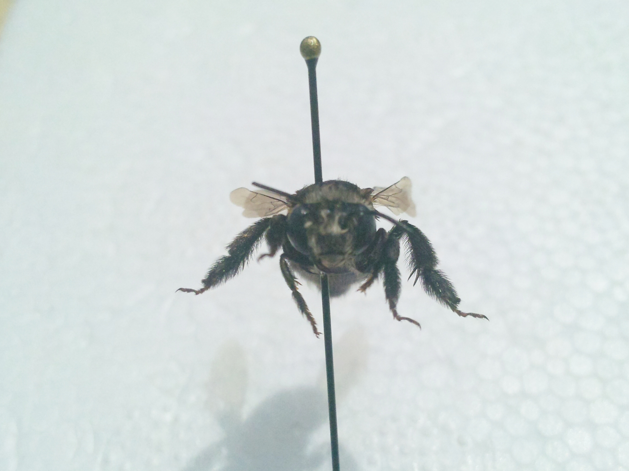 - Pubescences: Thorax densely covered with black hair except metanotum, propodeal area and T1 covered with fox-red hair (melanic specimens from Puerto Rico have thoracic hair all black except a tuft of ochraceous hair laterally on propodeum); hair on legs chocolate-brown, except ochraceous and black hair intermixed on outer apical surfaces of tibiae, tarsi and outer base of hind tibia (melanic specimens from Puerto Rico with leg hair all black except ochraceous patch on outer surfaces of apex of midtibia and basitibial plate of hind leg); T2-TS with posteriorly inclined dark hairs; T6 with black hair and white hair laterally; T7 all black; sterna with ochraceous hair except apical margin of S4 with black hair, SS with four dark apicosubmedian hair patches (Fig. 31 ).
